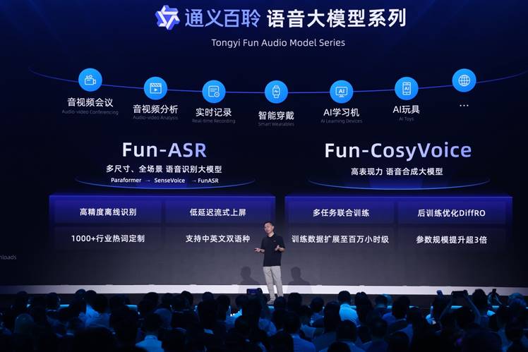此次云栖大会上,通义大模型家族还迎来了全新的成员——语音大模型通义百聆。百聆新发布了语音识别大模型Fun-ASR和语音合成大模型Fun-CosyVoice。Fun-ASR基于数千万小时真实语音数据训练而成,具备强大的上下文理解能力与行业适应性;Fun-CosyVoice可提供上百种预制音色,可以用于客服、销售、直播电商、消费电子、有声书、儿童娱乐等场景。