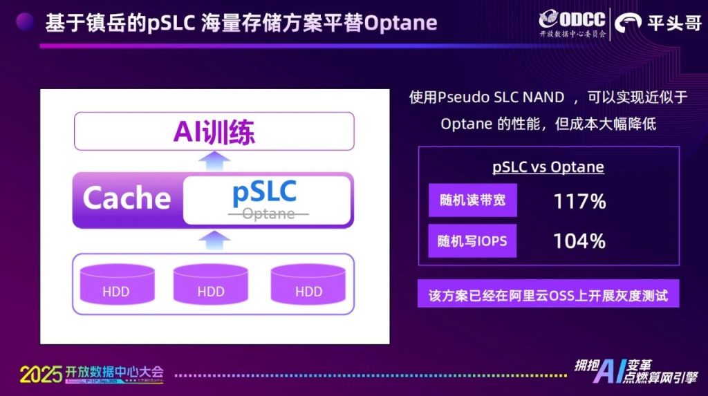 相对于目前主流的TLC SSD+硬盘的混闪模式,pSLC+硬盘的组合可以提供更高的读写IOPS,非常适合大语言模型训练前的数据准备阶段。数据准备是一种全局的、频繁随机读写的操作。这个阶段的数据比较“原始”,价值不高,用基于TLC SSD的全闪存储过于昂贵,而QLC SSD又不适合承受频繁的随机写,因而常使用成本较低的混闪阵列。用pSLC替代TLC SSD,可以进一步提升数据供给效率,减少数据等待期间的算力浪费。至于pSLC容量较小的弱点,在常规的混闪场景中可能会导致读缓存热数据命中不足的问题,但在数据准备阶段是可以规避的,因为访问的全局性导致更大容量的读缓存没有实际收益。此时,pSLC远高于TLC的耐久度更为关键,而略高于TLC的读写性能则是锦上添花。