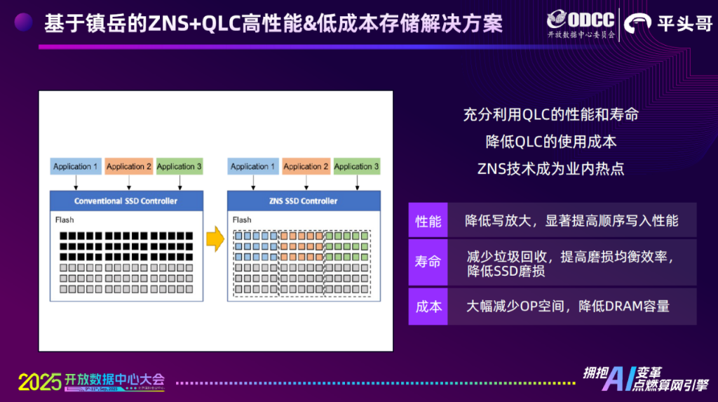 向下,镇岳510正在驱动ZNS+QLC的存储解决方案发展。镇岳510是支持QLC NAND的,生态合作伙伴可以基于这个主控推出大容量QLC SSD,以适应AI应用对高密度、高能效存储的需求。但平头哥想做的不仅仅是搭上当下大容量QLC SSD关注度的顺风车,而是进一步降低QLC SSD的使用成本,改善QLC SSD的性能与使用寿命。ZNS被业内视作QLC SSD的终极解决方案,可以最大化发挥QLC SSD的性能,并规避其随机写性能不足、耐用度较低的弱点。镇岳510所支持的ZNS协议可以让数据根据上层业务优化写入位置,将不同业务安排到独立的Zone当中,且对齐NAND介质Block粒度。数据在Zone内是严格顺序追加写的,当某业务的数据需要删除时,可直接清除对应的Zone。这种设计消除了传统SSD中的垃圾回收(GC)操作,将写放大降到最低,并提高了磨损均衡效率。镇岳510的通用核是RISC-V多核处理器,最高频率1.6GHz,有充足的处理能力维护ZNS SSD的Zone分区状态。