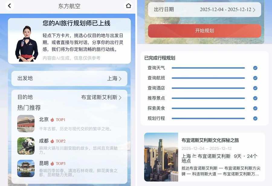 月4日凌晨2点,东方航空开通的上海浦东—奥克兰—布宜诺斯艾利斯航线正式首飞,全长近两万公里,成为全球首条连接对跖点城市的商业直飞航线,一举刷新全球最长单程航线纪录。结合这条意义非凡的首航之旅,为提升顾客体验,东方航空接入阿里通义千问,推出国内航司首个行程规划Agent,可快速精准解决航班组合、天气&交通查询、时差换算、转机衔接、旅行规划等繁复问题。