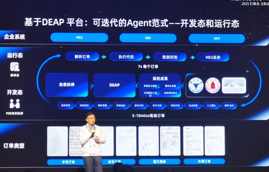 很快,他们都找了一家共同的合作伙伴。在这家企业的帮助下,友成机工无需新增开发人员,仅需上传一张新订单样本,AI即可自动规划、生成并部署专属Agent代码,全程仅需5–10分钟。该Agent可7×24小时解析各类非标订单,并无缝对接ERP、MES等系统,将单订单处理时间从1.4小时压缩至7秒,效率提升数百倍,错误率显著下降。