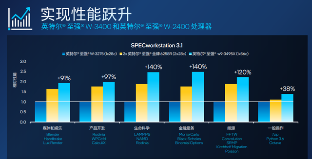在用于模拟工作站使用的主流应用的SPECworkstation 3.1评测中。至强W9-3495X相对上一代W-3275在不同的测试领域和工作负载情况下有着明显的提升,最高性能提升甚至达到140%,同样也领先两路至强金牌产品的性能。