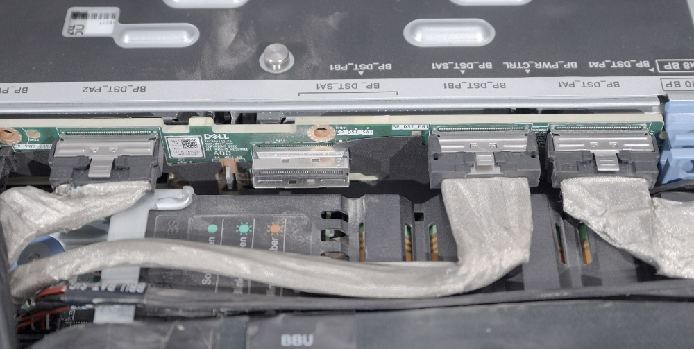 R660的基础架构是1U通用机型,前窗可以配置8或10个2.5英寸驱动器。这台样机前窗高速背板的5个MCIO x8端口全都连接,理论上可以支持10个NVMe U.2 SSD。