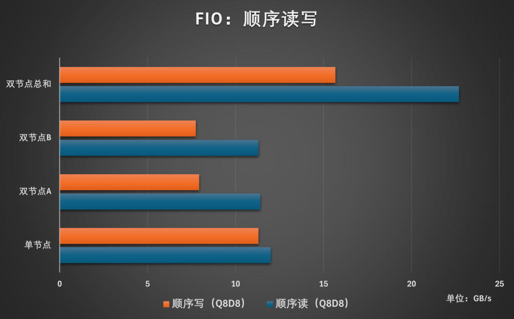 两个计算节点分别运行FIO,每个节点的顺序读也可以稳定在11GB/s以上,总和约23GB/s,也是近乎于跑满网络。每个节点的顺序写降到约8GB/s,总和15.7GB/s。