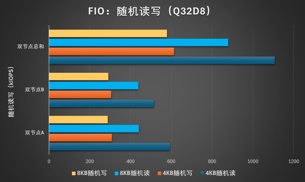 在256队列深度的随机读写测试中,两个计算节点的4KB读总和超过110万IOPS,随机读平均时延432微秒。8KB随机读的IOPS也可以达到4KB的80%水平,8KB随机写甚至可以达到4KB写的95%,这个表现对于喜欢用8KB数据块的数据库类应用是好消息。