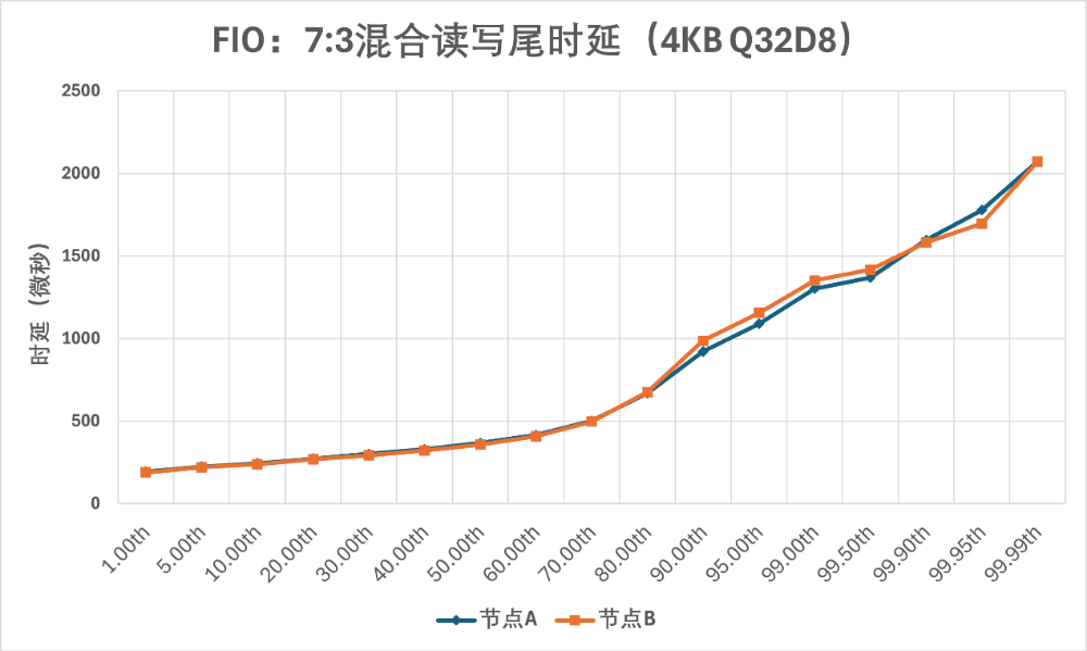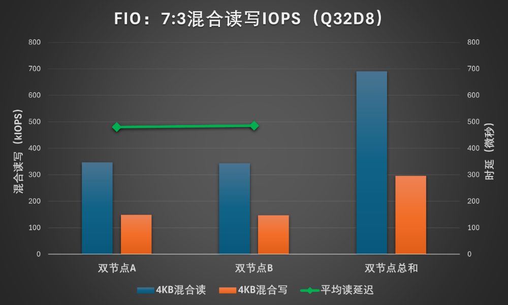 7:3混合随机读写方面,两个计算节点的读、写操作的总和将近100万IOPS,与纯随机读的IOPS相差不多。此时混合读的平均时延为480微秒。