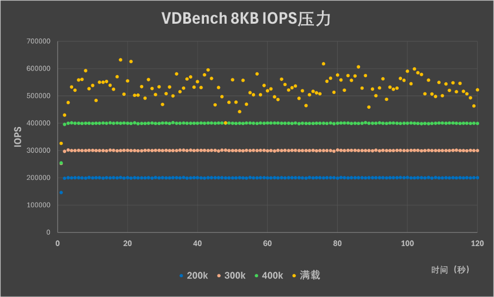 了解这个项目的上限之后,我们分别以20万、30万、40万IOPS为目标做固定压力的测试,可以看到IOPS波动很小。40万IOPS相当于满载水平的75%,用通俗的话说就是出八成的力,就能游刃有余了。