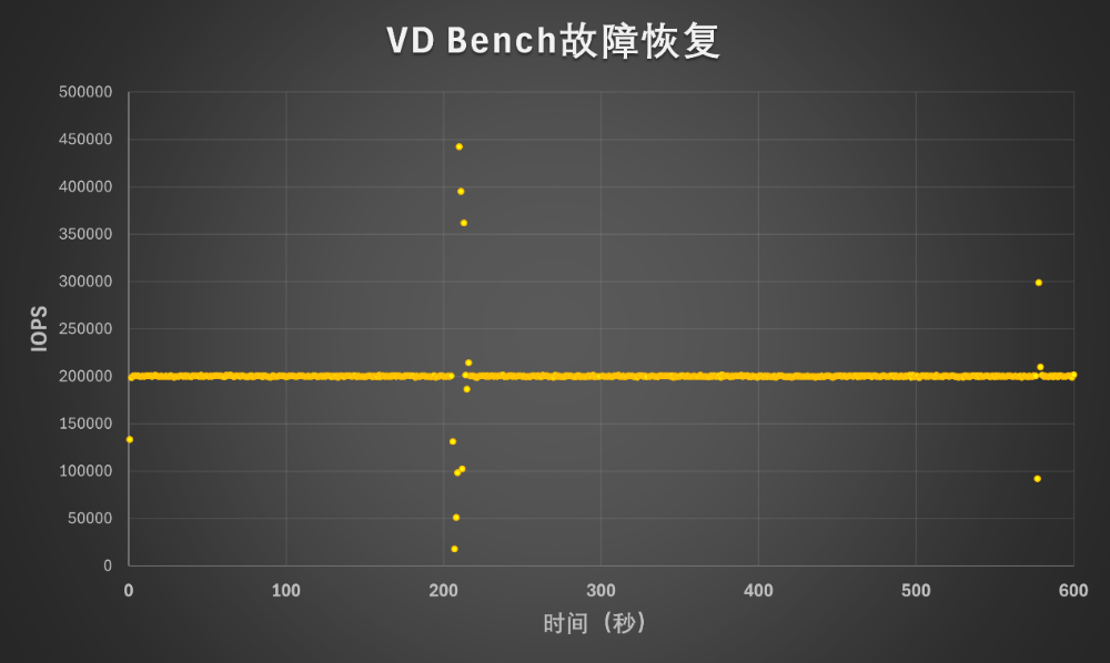 我们在VDBench中运行持续10分钟、20万IOPS的压力测试,期间断开一个存储节点的电源。