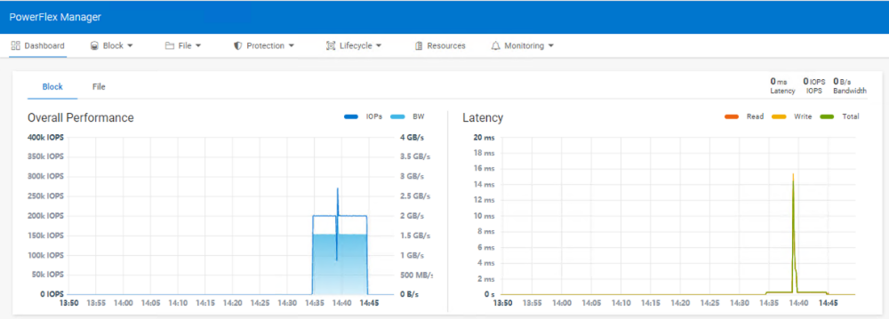 在PowerFlex Manager的控制面板也可以看到断电瞬间的抖动。在这个短暂的过程中,延迟数据从不到1毫秒突增至15毫秒左右,并很快恢复平稳。